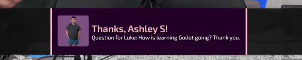 Ashley S | message | Thanks, Ashley S! Question for Luke: How is learning Godot going? Thank you. | Timestamp |