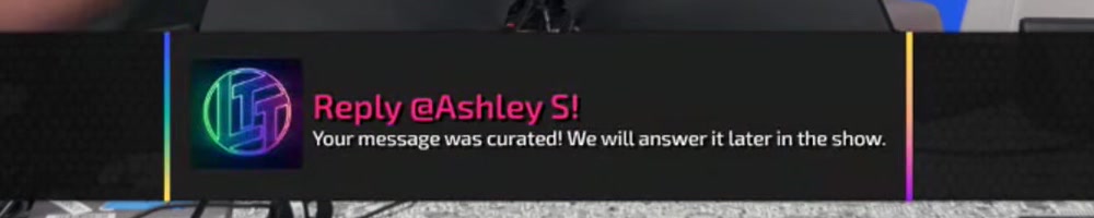 Ashley S | reply | Reply @Ashley S! Your message was curated! We will answer it later in the show. | Timestamp | ![]() |