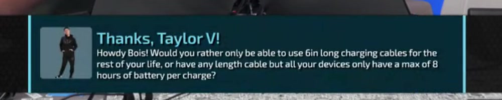 Taylor V | message | Thanks, Taylor V! Howdy Bois! Would you rather only be able to use 6in long charging cables for the rest of your life, or have any length cable but all your devices only have a max of 8 hours of battery per charge? | Timestamp | ![]() |