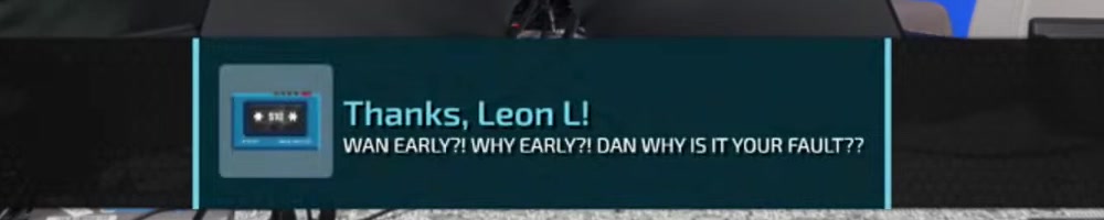 Leon L | message | Thanks, Leon L! WAN EARLY?! WHY EARLY?! DAN WHY IS IT YOUR FAULT?? | Timestamp | ![]() |