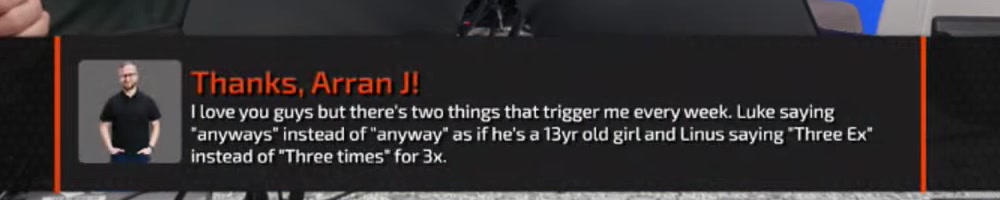 Arran J | message | Thanks, Arran J! I love you guys but there's two things that trigger me every week. Luke saying "anyways" instead of "anyway" as if he's a 13yr old girl and Linus saying "Three Ex" instead of "Three times" for 3x. | Timestamp | ![]() |