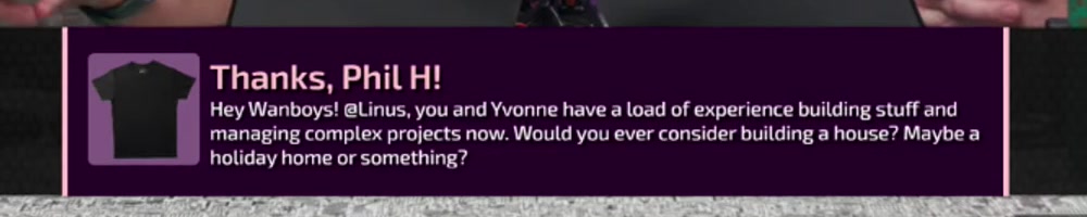 Phil H | message | Thanks, Phil H! Hey Wanboys! @Linus, you and Yvonne have a load of experience building stuff and managing complex projects now. Would you ever consider building a house? Maybe a holiday home or something? | Timestamp | ![]() |