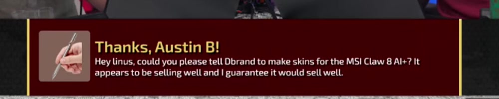 Austin B | message | Thanks, Austin B! Hey linus, could you please tell Dbrand to make skins for the MSI Claw 8 Al+? It appears to be selling well and I guarantee it would sell well. | Timestamp | ![]() |