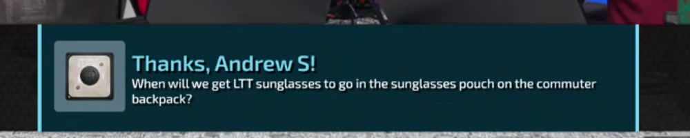 Andrew S | message | Thanks, Andrew S! When will we get LTT sunglasses to go in the sunglasses pouch on the commuter backpack? | Timestamp | ![]() |