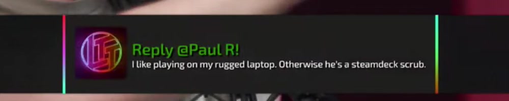 Paul R | reply | Reply @Paul R! I like playing on my rugged laptop. Otherwise he's a steamdeck scrub. | Timestamp | ![]() |