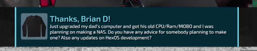 Brian D | message | Thanks, Brian D! Just upgraded my dad's computer and got his old CPU/Ram/MOBO and I was planning on making a NAS. Do you have any advice for somebody planning to make one? Also any updates on HexOS development? | Timestamp | ![]() |